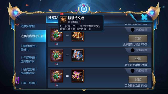 兑换商店已经限时开启,将在6月5日永久结束兑换,这个活动奖励还是非常丰富的,不要忽略了自己背包中的活动道具。疯狂碎片可以兑换皮肤碎片、英雄碎片,而勇者徽章则可以兑换高级铭文,小白狐一口气就换了27个3~5级铭文,这也是一笔大资源。