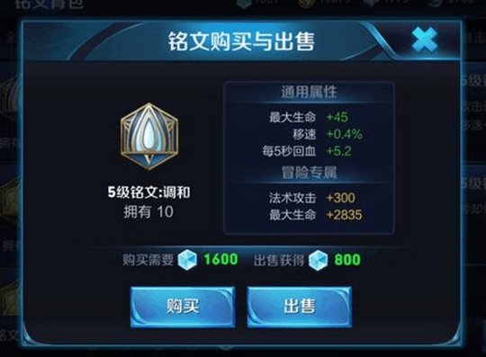 另一个上单神器就是调和铭文,他的作用就是增加英雄的生命值、移动速度以及回血功能,对于上单来说,作用可是相当的大,10个调和铭文在身,像陈咬金这样的英雄,五秒就能回复197点血量,可谓是一夫当关万夫莫敌。
