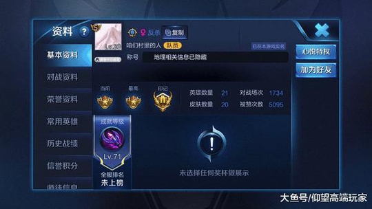 就在玩家进新区的时候,遇到了一位实力隐藏的对手,可以说这实力简直相当的瘆人。请看这个对手打了1734场,胜率保持在99%,目前最高段位达到荣耀了,当你们看到这情况,是不是有点吓呆了?