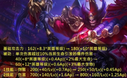 钟馗这个半法师半战士英雄,这一次也提升了1、2技能的前期伤害,看似是把后期的AP加成给削一半,其实到了后面钟馗的伤害还是比以前高的,还要基础攻击力也是从162+8.3直接升到180+10。