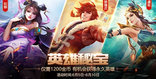 金币抽永久英雄也来,天美要消耗你们一波金币,6月5日开启,到6月10日结束,只用花1200金币你就有机会抽到:貂蝉、裴擒虎、虞姬等永久英雄,心动不如行动,有钱就去抽一抽吧,这个英雄秘宝礼包在商城里面。