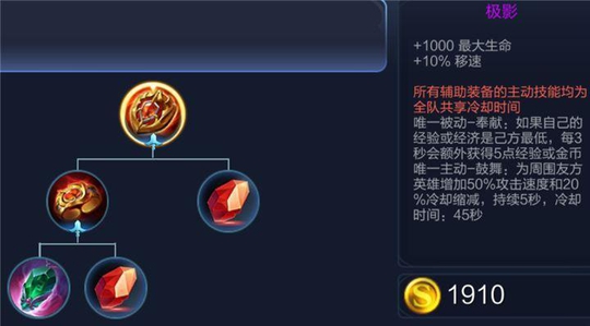 在辅助装备的四个大件中,极影的出现频率是最低的,几乎见不到有辅助会出这件装备,一般的辅助都会选择救赎之翼,因为它有护盾;或者是奔狼纹章,它能全体加速;或者是近卫荣耀,它能为队友增加攻击力。反观极影,给队友增加攻速和冷却缩减,只能对射手这类需要攻速的职业以及少数攻速战士有点作用,或许三射手、四射手的阵容,玩辅助时可以出个极影。