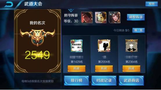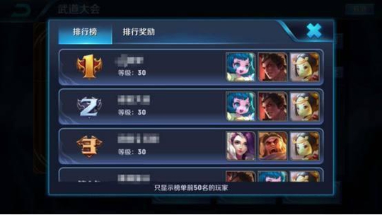 在武道大会中除了挑战对手还要防御对手的挑战以此守住自己的排名,所以需要一整套攻防阵容来取得成绩。我们需要设置防守阵容,这个阵容我们可以参考其他玩家的阵容策略。在排行榜中可以看到排名前50的玩家防守阵容,对比后选择合适的英雄阵容。
