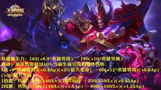 钟馗这一次加强使基础伤害得到了史诗级增强,基础伤害到满级后总共提升了33.5的攻击力,同时被动所增加的伤害量提升了80,同时法术加成有0.4增加到了0.6,这使得他的法术伤害进一步提升,同时有2%的生命加成到达了3%生命加成,这增强了他在后期的生存能力;不仅如此钟馗的一二技能基础伤害都得到了提升,一技能的基础伤害增加了200,二技能的基础伤害量增加了400,但是相应的其法术加成得到了减少,但是总体来说其伤害还是得到了提升。