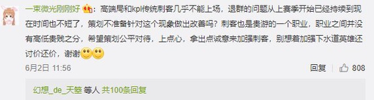 还有玩家表示高端局和KPL刺客都不能上场,的确当前版本刺客的地位确实很尴尬,李白、韩信、兰陵王这种传统刺客的表现都不强势,策划是不是应该还好思考一下这个问题呢?