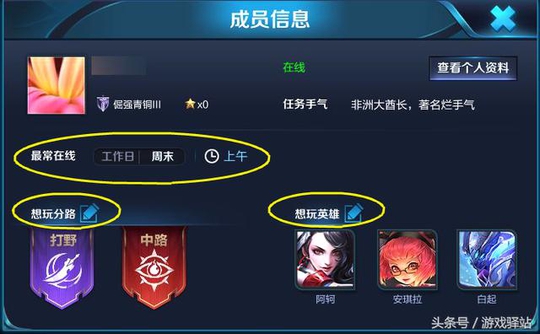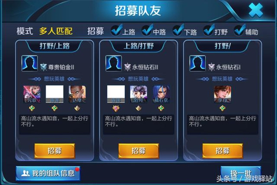 队友招募 :该功能目前还在体验服测试,玩家可以通过个人资料定制自己的专属组队卡,如果找不到好友组排时可以通过组队界面的招募功能寻找擅长不同分路的队友,现版本招募队友界面如下图所示: