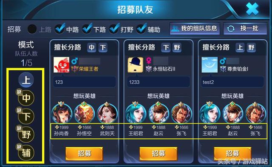 在全新优化升级后左侧增加了需要招募的分路信息,同时还显示了队友常用英雄的荣耀战力情况,能够让玩家大致了解队友使用这些英雄的熟练程度和水平!