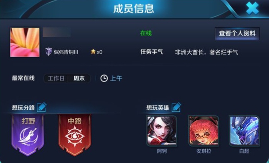 小队功能优化,在小队界面中可以点击成员头像进入查看详细信息,可以看到在线时间和想玩的分路与英雄等信息。另外删除了一些小队任务中比较难完成的任务,例如全员观战等。