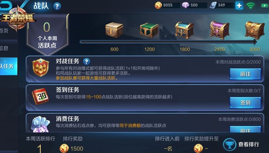 战队功能中新增了战队任务,类似于每日活跃度的设定,有更多的战队专属任务,例如日常的游戏对局,签到活跃度,消费钻石和点券,都可以提升对应的活跃度。而战队内存在活跃度排行,最高每周可以获得一千五百的金币奖励(人少的队伍美滋滋,不过金币数估计会与战队等级挂钩)。战队活跃度也会给予每周宝箱奖励,目前未知具体奖励内容。