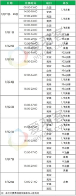 亚运会羽毛球比赛分为团体项目和单项比赛。8月19日至8月22日进行男团、女团比赛,8月23日至28日进行五个单项的角逐。