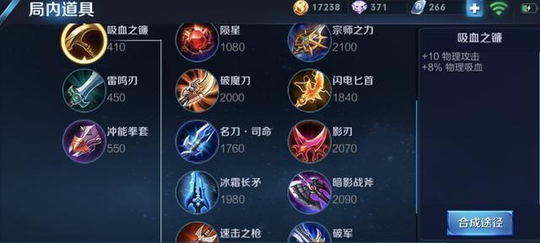 最后就是射手了。很多小伙伴玩射手喜欢一味的追求爆发以及高输出,这就有点头铁。不妨先出个吸血之镰,比起制裁也仅低了2%的吸血效果。却只需要410金币就能入手,而且关键后期还不用出售,调整一下装备的优先级就能极大减少回家次数,积累出更多经济优势。