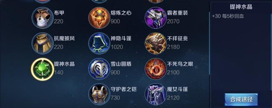 此外,作为上单,一定的回复能力能够更是赖线的资本所在。如果本身所选择的英雄不具备回血能力,不妨选择出一两个提神水晶来过渡一下。虽然拖了一点经济,但可以有效的减少回城的次数。也是性价比挺高的一件小装备。140入手,84卖出。