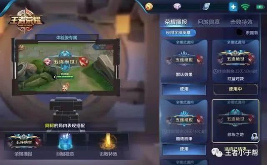 英雄个性化定制:未来英雄展示界面将新增定制按钮,玩家可以通过该功能为每位英雄搭配专属的荣耀播报、回城和击败特效,即属于英雄的“私人订制”,同时这三种局内表现还可以直接点击进行预览观看!