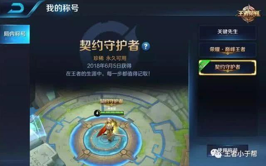 值得一提的是获得的局内称号可以在游戏内展示,即游戏开局时自动展现,类似熟练度徽章。从下图可以看到称号有珍稀和普通之分,比如关键先生、巅峰王者和契约守护者等!