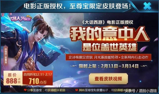 最早接触到王者荣耀的时候,就曾被露娜的皮肤迷住过,那就是紫霞仙子。但那时候只有紫霞仙子,并没有至尊宝。这时候就在想,如果弄个至尊宝该有多好。而此时恰好经历了一波因为可能涉及侵权而皮肤改名的事件,一些和卡普空知名游戏重名的皮肤都被改了名字。但是紫霞仙子并没有改名,而是在后来的一次更新增加了月光宝盒的设计。终于有一天,见到了这样的官方宣传。孙悟空终于上线了至尊宝皮肤,还是《大话西游》电影正版授权的皮肤,也终于和露娜的紫霞仙子有情人终成眷属。