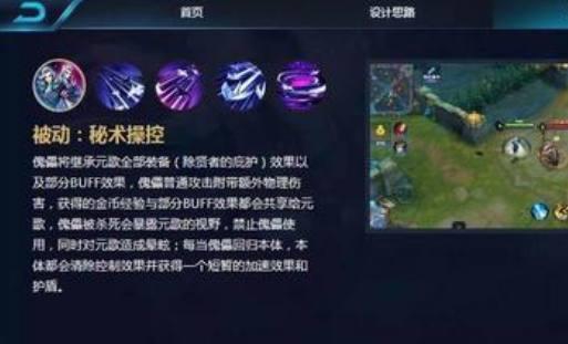 被动技能:秘术-操控。简单的来说就是,元歌的本体和傀儡宝宝之间存在着共享的关系。但是复活甲是不能共享的。宝宝自身也带有攻击效果,可以把自己所得的一切都算在本体的头上。但是宝宝被杀死的时候,本体的位置就会暴露,并不能再使用宝宝,而且自身也会被眩晕。所以大家玩的时候,一定要保护好宝宝哦,要时刻注意它的血条。