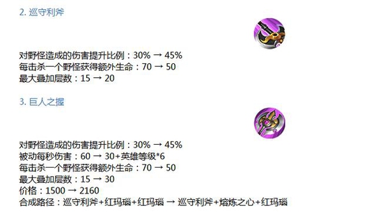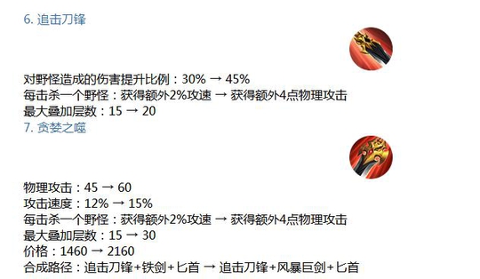 基础打野刀对野怪的加成伤害提升至35%,而成型的打野刀将提升至45%。所有打野刀全面升级,其性价比也将进一步提高,打野后期不必再更换装备。