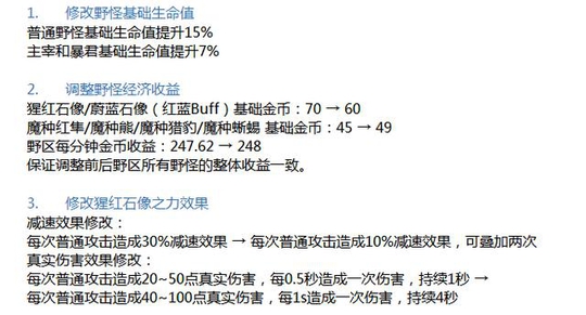 野怪血量提高,击杀小野怪获得的金币增高,击杀红蓝buff获得的金币降低,减少打野让buff的经济损失。而红buff的效果削弱,减速效果降低,附带真伤减少。
