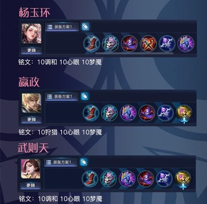 杨玉环的话,巫术法杖就是她的神器。至于嬴政和武则天两个土豪英雄,装备是一样的,不过铭文有一点差别,因为嬴政有时候的普攻比较厉害