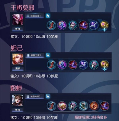 干将莫邪和妲己两个英雄都是爆发英雄,因此咋一轮爆发后要保住命还是靠调和铭文以及辉月。至于貂蝉,这是一个消耗英雄。所以出了吸血书和不死鸟之眼,这些让她的持续能力作战更强,最后还可以把cd鞋换成金身。
