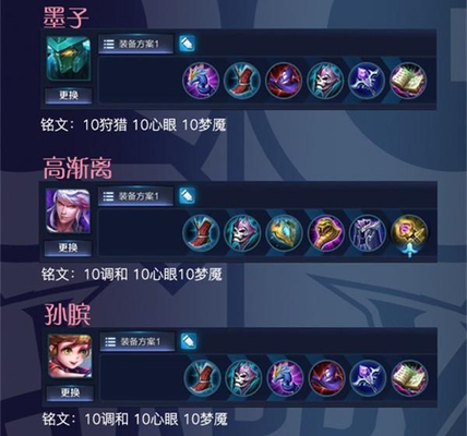 而墨子携带狩猎就是为了移动速度了,高渐离和孙膑都带着调和这个铭文。确实这个铭文的性价比是非常之高的。同时高渐离也是出了一身半肉装。这样他能够冲到敌人人群中去打出巨额伤害。