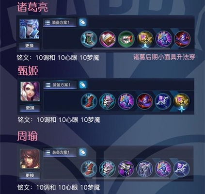 最后是诸葛亮,甄姬和周瑜。甄姬的装备比较常规,而诸葛亮开始只用出一个小面具,之后再升级。周瑜装备的话就有点像半肉装了。有时候也可以当一个吸引敌人火力目标,毕竟自己现在也有防身技能。