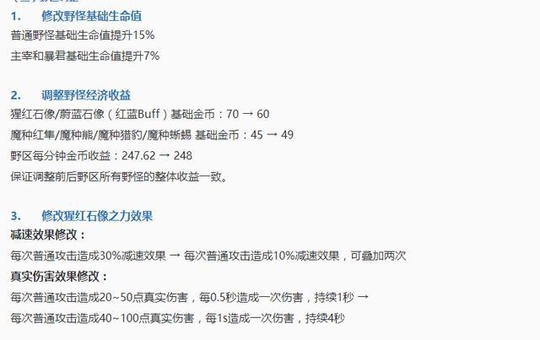 同时,野怪血量提高,击杀小野怪获得的金币增高,击杀红蓝buff获得的金币降低,减少打野让buff的经济损失。而红buff的效果削弱,减速效果降低,附带真伤减少。