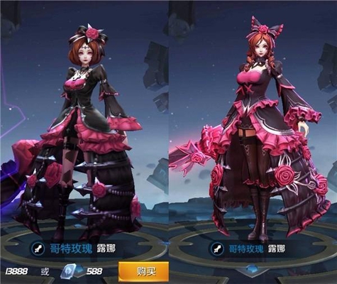 哥特玫瑰也做出了很大的改变,最直观的就是身上的玫瑰色变得更加艳丽了。相比较以前的黑色+玫瑰色的搭配,新版的采用的是咖啡色+玫瑰色的搭配,看起来更漂亮。还有就是头部变化很大,虽说还有蝴蝶结,但是这次变得更加精美了。人物发型由原来的短发,变成了卷发,颜色也亮了许多。总体上来看,新版本的露娜更像是少女了,老板的贵妇感很强。另外,武器上面的转变也很大,玫瑰色和蝴蝶结的装扮更惹人喜爱。