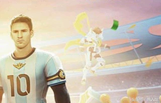 这两天王者荣耀的裴擒虎梅西皮肤就要出来了,官方也发布了它的一些特效和宣传图。特效之前也给大家都看过了,那么这个宣传图的右边还有一个细节,可以看到一个人在天上飞,我们把这个地方放大来看一看就知道了。