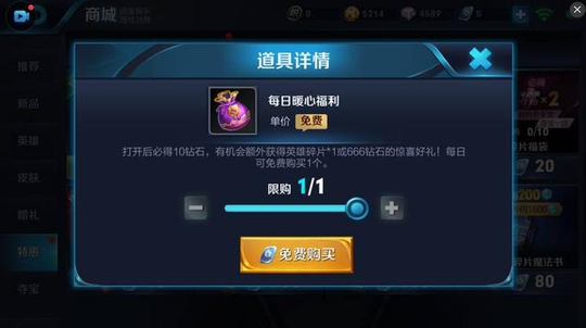 现在,这个每日暖心福利活动的奖励内容为:打开必得10钻石,可以额外开出1英雄碎片或666钻石奖励,每个玩家每日可以免费购买一个。