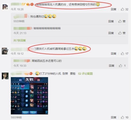 最后实在没有办法靠主宰带着小兵打掉了对方的水晶才结束了这场闹剧,只能说现在人机也越来越厉害了,玩的很生疏的玩家搞不好就像这位小伙伴一样被机器人打脸。当然也有网友表示“现在机器人真的凶,还有假装回城勾引我的。”,也有玩家说道:“朋友打人机被机器周瑜拿过五杀”,难道是腾讯把人机模式下机器人变得灵活会思考起来了么?现在机器人有这么厉害了。