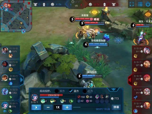 此时我方上野辅三人,对方射野辅也是三人,我方打野判断还是可以gank继续向前走位并打了猴子一套三环猴子残血走开了,我对着河道蟹放了二技能通过弹跳将对方射辅连控了两次掩护走位稍微靠前的狼狗,宫本看到对面被控上来补了两下伤害后羿倒了。