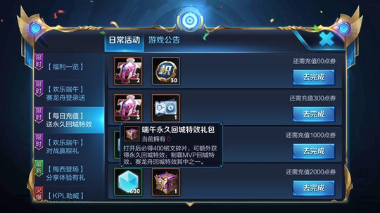虽然充值活动海报上写的是送端午永久回城特效礼包,但这也直接误导了大家,以为是100%得端午节永久回城特效。其实这个礼包里面有两个回城特效,一个是MVP回城特效,另外一个是赛龙舟回城特效,但这也会优先获得未拥有的回城特效,如果两款特效都没有,那只能看脸了。