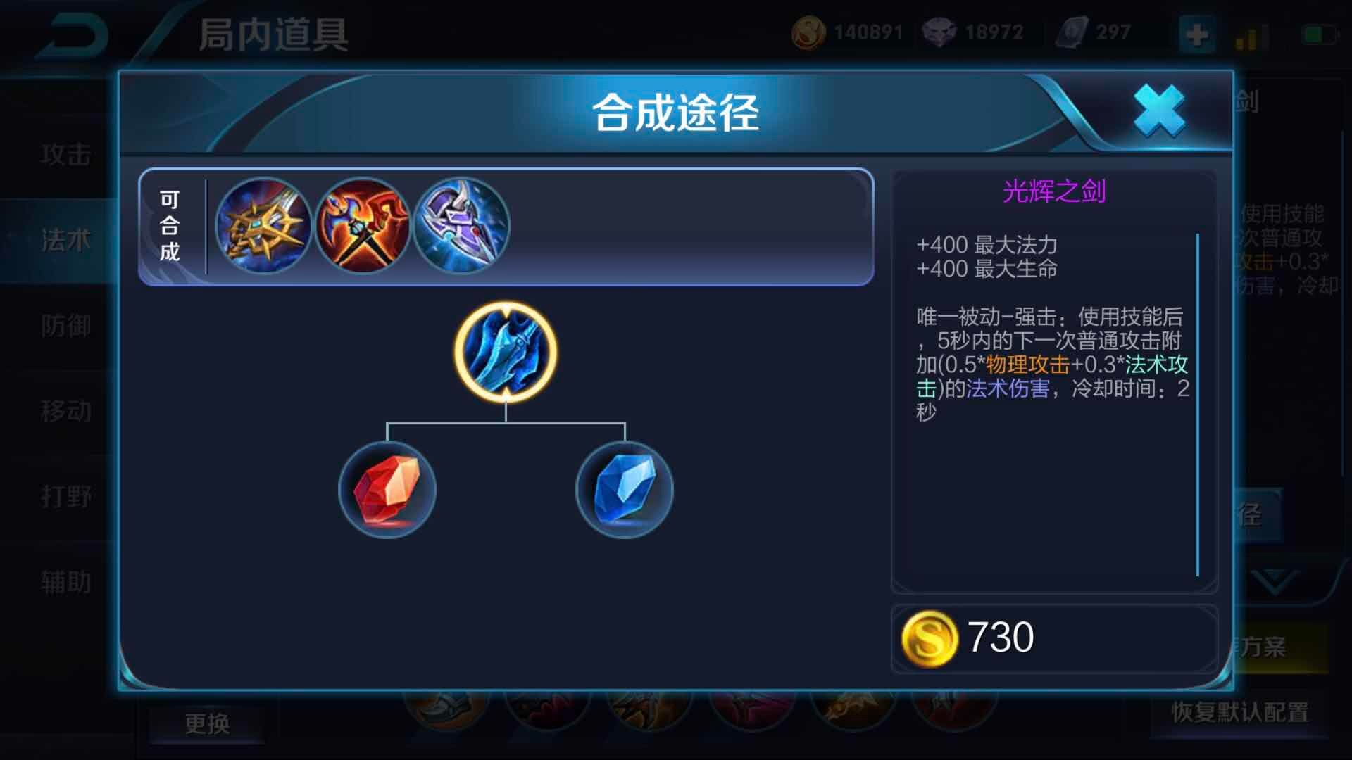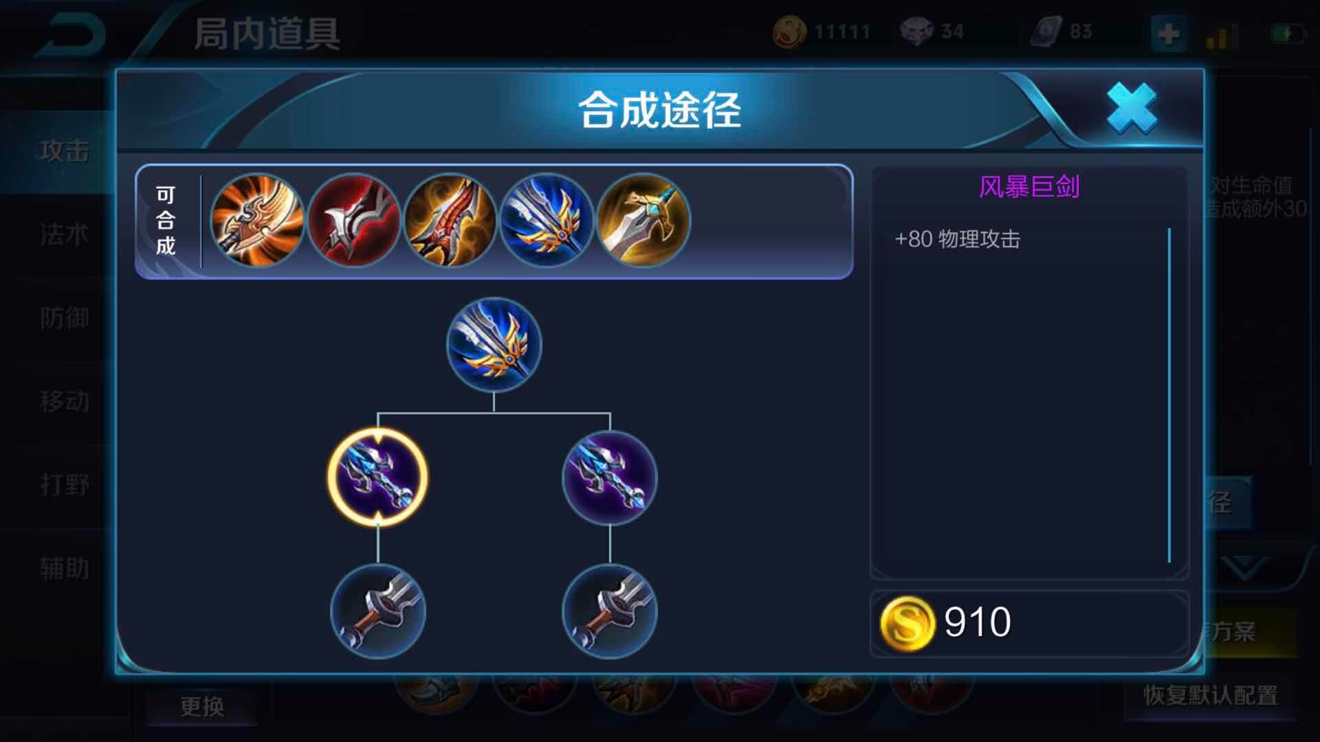想合成大件装备,就先需要做一些小件来支撑,比如要合成破军,就需要两个暴风巨剑才行。