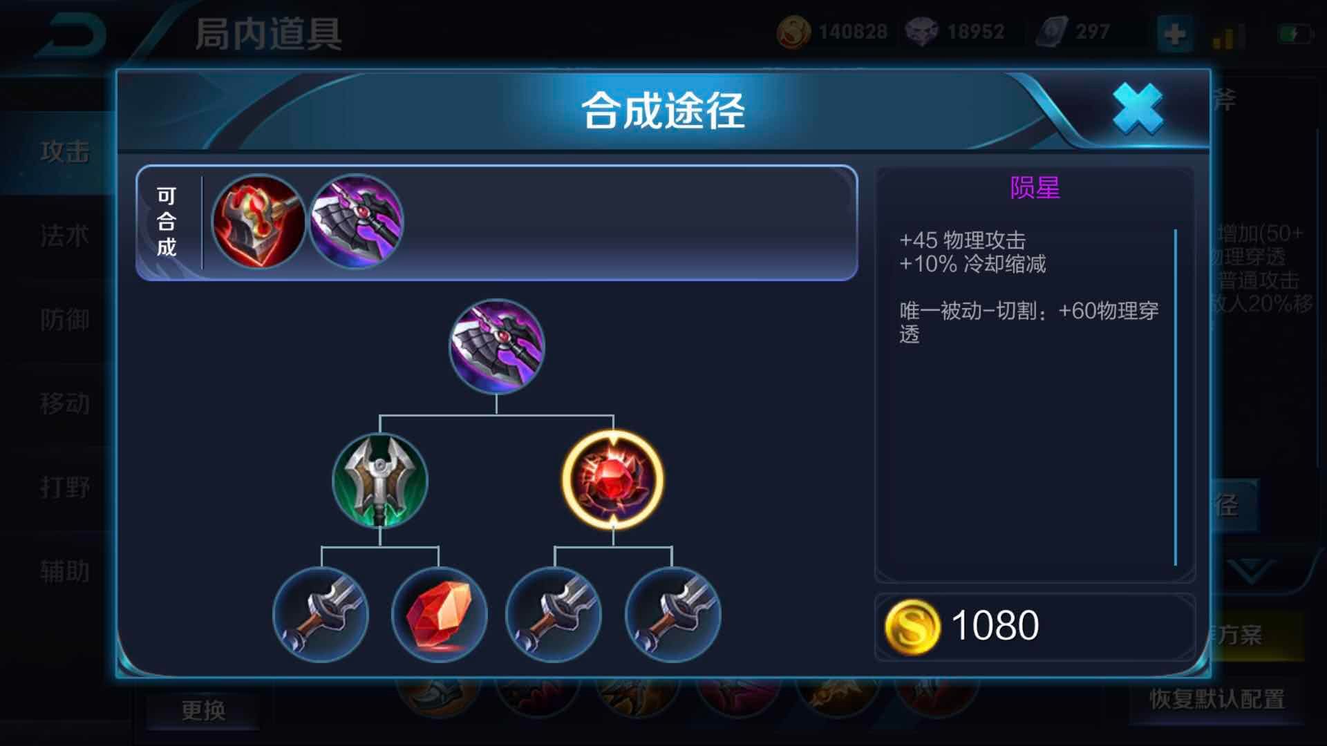 而另外一件“过渡装”,陨星,增加45点攻击力,10%冷却,附带60点物理穿透,价格在1080金币。