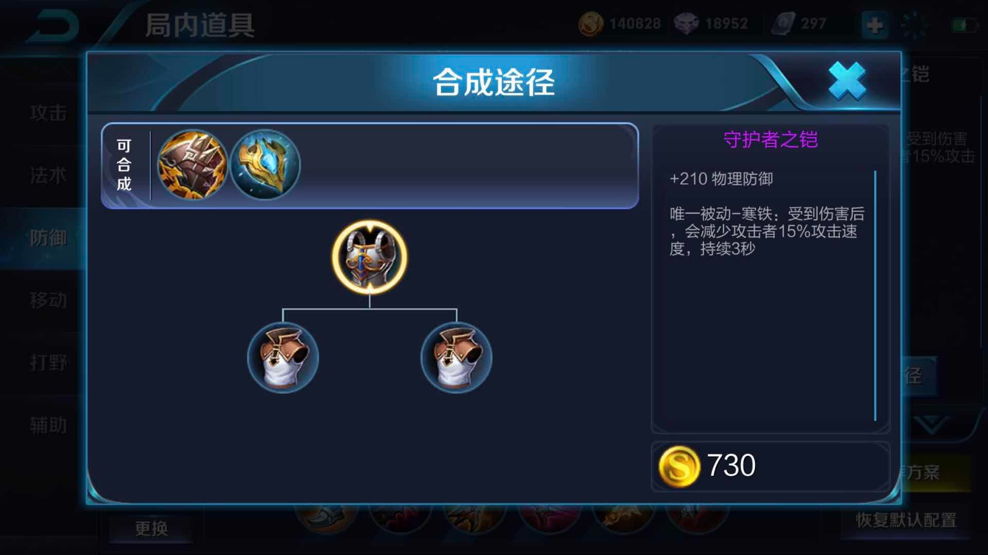 守护者之铠是不详征兆和极寒风暴的“过渡装”,能增加210点护甲值,还附减少敌人15%攻速的被动效果,价格也只要730金币。