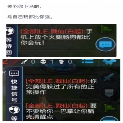 在一场匹配对局中由于这位小伙伴技术上不达标,导致对面人头飞快的增长,经济基础一下子拉开距离,气的己方队友直接开全部频道对这位小伙伴进行人身攻击。令人惊叹的是全程没有用一个脏字,例如“手机上放个火腿肠狗都比你会玩”、“你完美的躲过了所有的正常操作”、“要不要给你一巴掌让你脑袋清醒点”,够犀利的语言,这位玩家是不是学中文系毕业的,用词用的这么好。