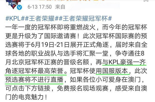 通过微博我们开始得知,从2018年开始,一年一度的冠军杯将迎来升级,KPL冠军杯升级为国际邀请赛,也就是说,KPL王者荣耀赛事从今年开始,将正式走出国门,面向全世界,6月19-21日,来自全球各地职业战队和选手将汇集一堂,进行预选赛的角逐!