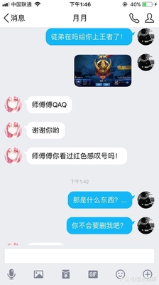 事情是这样的,这位师傅辛辛苦苦替徒弟打上王者,找徒弟报喜。这位叫月月的徒弟,用女孩喜欢的说话方式表示感谢并要送师傅一个红色感叹号。师傅一听懵了,什么是红色感叹号,难道是要删我好友? qq好友一旦被对方删除,发给对方的消息前面就会带一个感叹号。