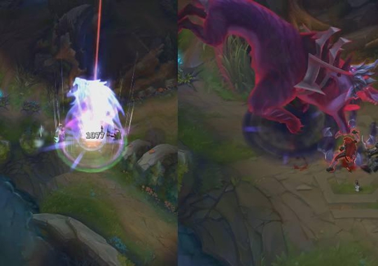 在特效上盖伦的皮肤以银白色为主,其中W技能和R技能的斩杀效果还有死亡时都会有狮魂出来。而诺手的皮肤以紫黑色为主,R技能斩杀和死亡时也会有狼魂出来将对手吞噬。