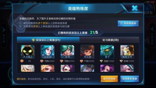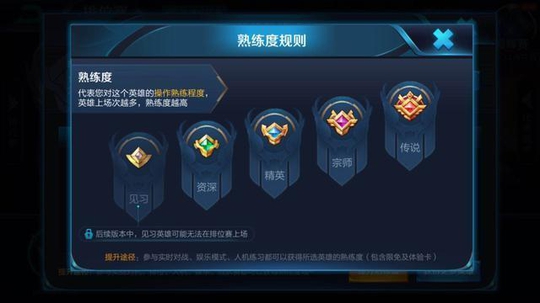 排位赛将结合熟练度搞一波大事情: 在后续版本中,见习熟练度的英雄,将不会让选择上场。最少都是资深的熟练度,虽然只是绿色那一栏,可能你还会觉得比较坑,但是已经很不错了!至少已经玩过几盘了,熟悉技能是什么了!