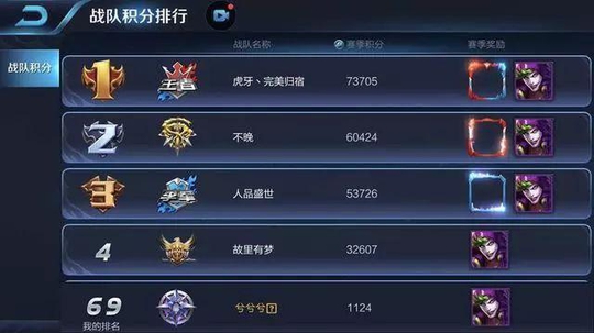每个赛季的战队奖励总共有两样,一样是钻石,一样是皮肤。只要排名在前一千,那就可以拿到1000钻石和高渐离的皮肤,如果你的战队在区内可以排到前三名,那你的还可以获得赛季战队奖励鎏金头像框,这个头像框跟50级成就点拿到的那款差不多,甚至第一的头像框比起成就奖励的头像框还要炫目!