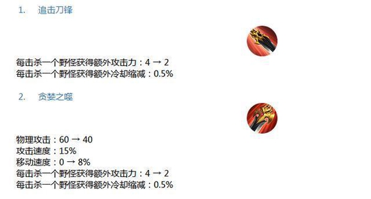 贪婪之噬攻击力下调,新增冷缩与攻速属性。而追击刀锋最大叠加层数是20层,可以获得40攻击+10%冷缩,贪婪之噬最大叠加层数是30层,可以获得100攻击+15%冷缩+15%攻速+8%移速。