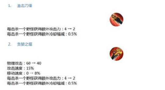 打野刀中的贪婪之噬被削弱了,攻击力下降,增加了冷却和攻速属性。这样的调整的感觉有种从职业武器变成了大众武器。