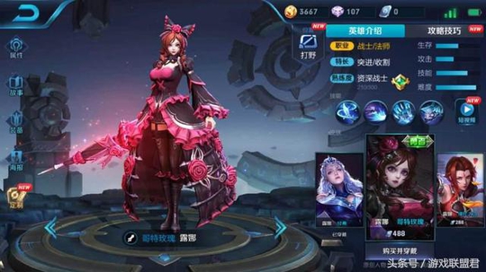 哥特玫瑰,原画海报与旧海报相比,新海报的额头上多了一缕发髻,这让冷酷的露娜多了一丝柔情之气,刚柔并济的哥特玫瑰让她在众多海报里显得特别温柔。同样是具有特效的皮肤,她的印记比绯红之刃浅很多,属于不是很常见的皮肤。