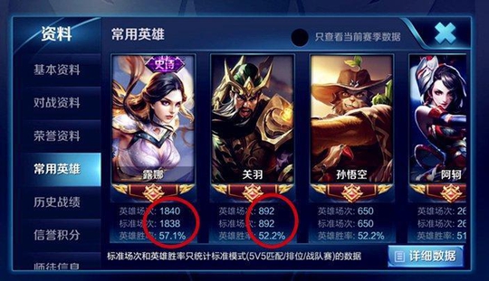 该玩家的露娜战绩是1800多场,但是胜率却只有57%,按道理来说,应该早就王者了才对。可是,我们看到他其他几个常用英雄的胜率,有点惨不忍睹,才52%而已。我们知道,随着版本的更迭,现在李白露娜这种刺客型打野,都不怎么吃香了。尤其是露娜这种英雄,对蓝buff的需求非常高,一旦没有蓝buff就会非常难受。虽然后期很猛,但前期一旦被压制就很难起来了。