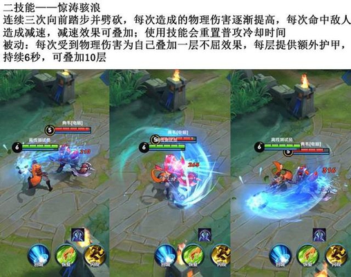 孙策的二技能类似曹操的一技能,向指定方向发动三次劈砍,每次命中敌人都会造成减速效果。