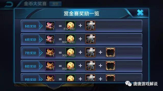 从赏金赛奖励公告可以看到,只要能有五次胜利,就可以赚到额外的金币,还有一个英雄碎片奖励,而多胜利一次得到的额度也是大量增多的,十胜的时候就能获得最高1260金币!