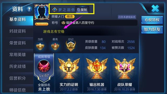 其实,游戏名是没错,问题就出在空格上,王者荣耀中的游戏名是可以有空格的,而真正的梦泪游戏名每一个字之间都有空格,所以大家有时候在游戏中遇到的梦之泪伤并不一定是真的。而且,梦泪在微信区和QQ区都有账号,并且不同的账号之间的空格是不一样的,苹果区的梦之泪伤是每个字之间都有空格,QQ区是第三个字和第四个字之间空格。