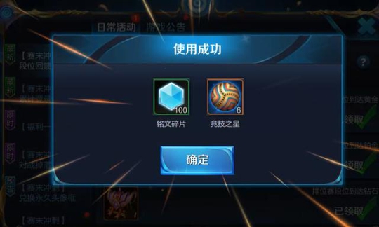 钻石段位的宝箱开出了100个铭文碎片和6个竞技之星,第一个只有2个竞技之星,第二个有4个。